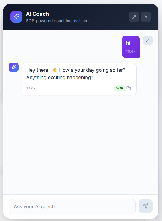 Gemini-powered coach trained on your SOPs. Get instant, contextual advice in a floating panel — no page switching.