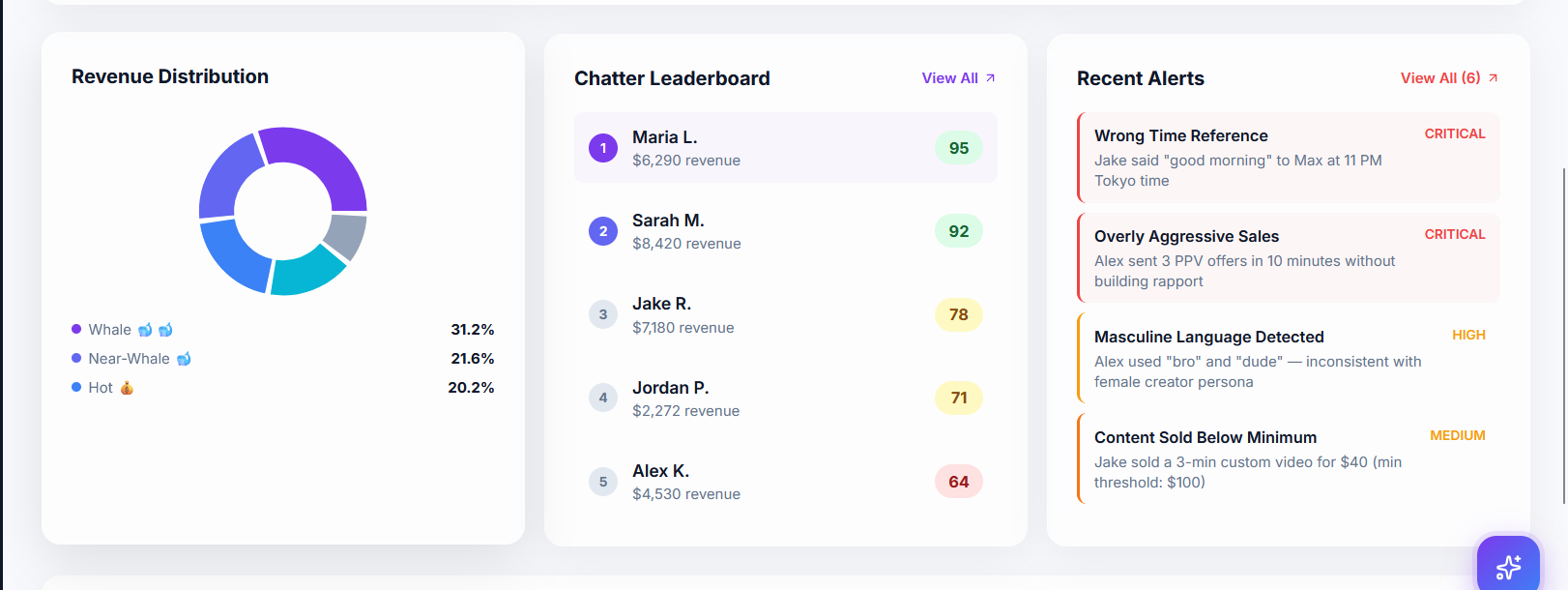 Instant flags for timezone errors, aggressive selling, character breaks, and SOP violations before they cost you.